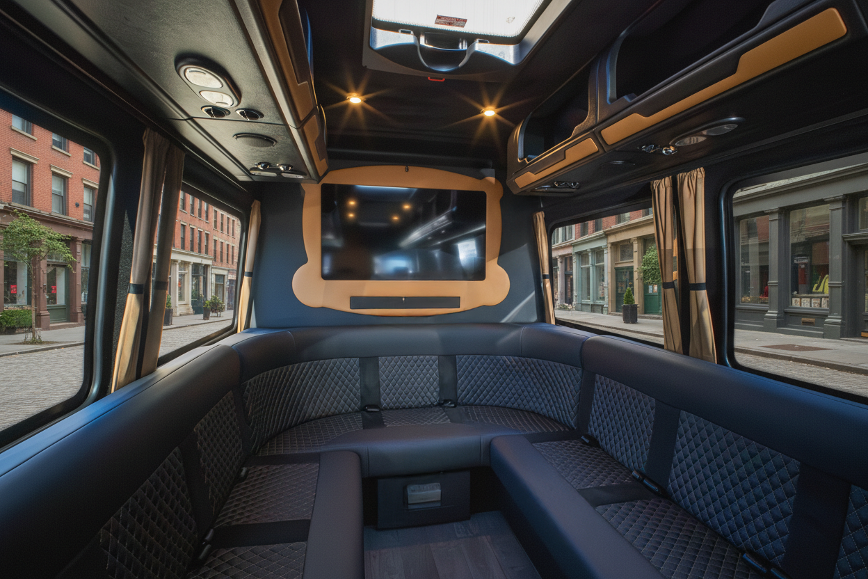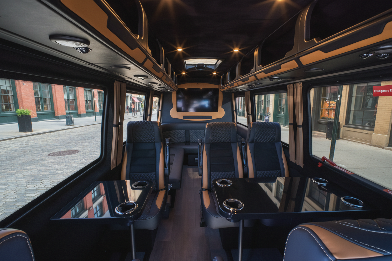 The Mercedes-Benz Sprinter Deluxe is all about comfort, safety and style. Featuring room for up to 14 adult passengers, Best-In-Class1 roof, custom bar area, flat screen plasma television, side step-in heights and a wide entry, it has the most inviting and elegant interior ever.